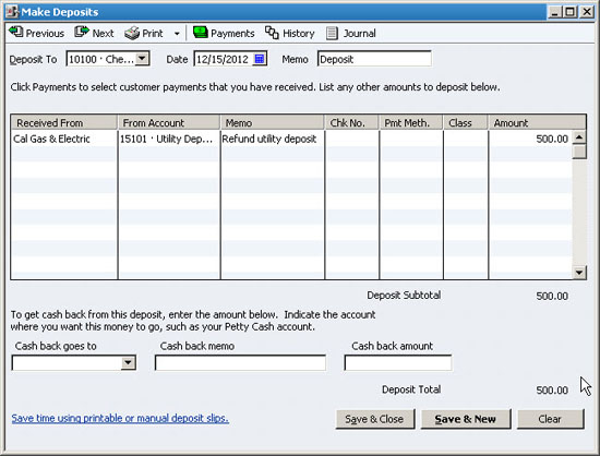 Choose Banking, and then Make Deposits. Specify the vendor, and then choose the account. In the case of deposit refunds, you should have an asset account that you'll apply the money against, as shown in Figure 2. For other types of refunds, use the expense account from which you originally paid the money.