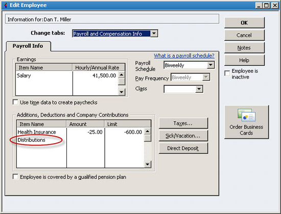 Next, select the employee in the Employee Center, and then choose Edit Employee. Choose Payroll and Compensation Info from the Change Tabs list, and then add Distributions to the Additions, Deductions, and Company Contributions list, as shown in Figure 3. You can fill in the distribution amount now if you know the ongoing amount, or you can fill it in on the fly during the payroll process. Simply display the Paycheck Detail during the payroll process to access this field and enter the distribution amount.