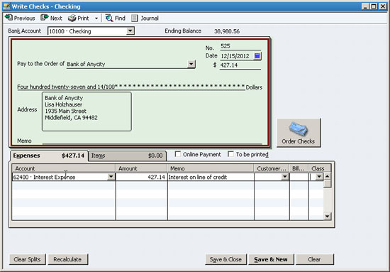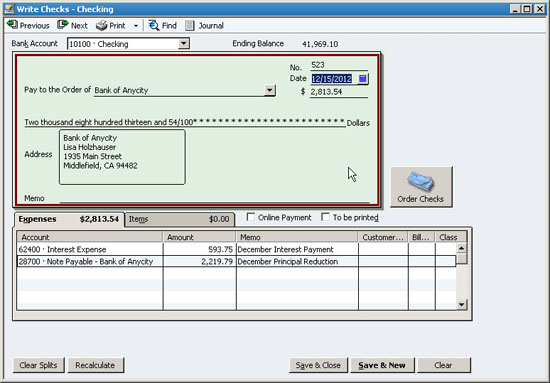 - Interest and principal payment: If you’re amortizing the loan over time – your payments include principal and interest – then you’ll have to charge two accounts on the transaction, both the Interest Expense and the Loan account itself, as shown in Figure 7. These amounts will be different each month. Your lender can provide an amortization table, or you can search for one for free on the Internet. Simply use the search term “amortization table” to uncover a variety of free resources, or use this search term to locate an Excel-based solution: “amortization table site:microsoft.com”