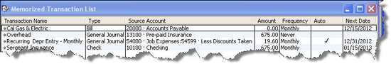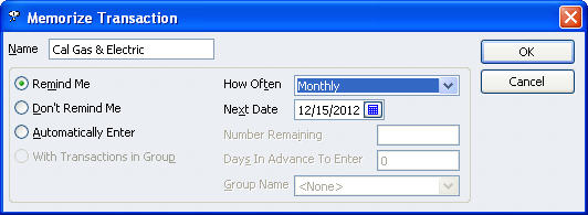 A memorized transaction could be bills that show up in the same amount every month, like your Web-hosting payment, or obligations that change regularly, like your utility bill. You can specify the amount due if it's static, or leave the amount open if it regularly changes, making this feature very flexible and easy to set up.