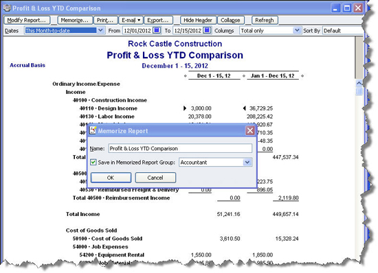 When you want to use a memorized transaction, click the Lists menu, then Memorized Transactions List to open the dialog box shown in Figure 3. You can also “memorize” repetitive reports. Open the report you want to work with by clicking, for example, Reports/Company & Financial/Profit & Loss YTD Comparison. A dialog box like the one in Figure 4 opens. Accept the name presented, or change it to one that you’ll more easily recognize. If you want to save reports in groups you’ve created, like Accountant, select the group from the drop-down list.