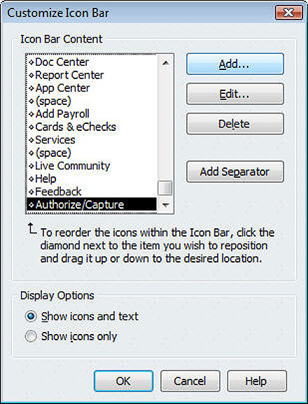 The Customize Icon Bar window contains all the tools you need to modify the navigational icons displayed in the QuickBooks icon bar.
