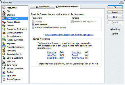 You have some control over what appears on the Home Page. To make changes, click Edit | Preferences, then Desktop View and then Company Preferences tab to display the window in Figure 4.