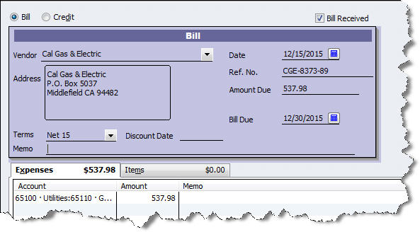 - Enter bills as (or after) you receive items