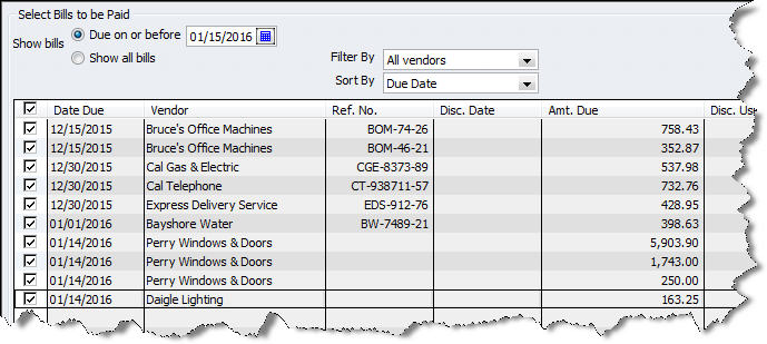 When bills are due, click the Pay Bills icon or select Vendors | Pay Bills. A window opens displaying all outstanding bills. You can pare this down by selecting a date in the Due on or before field and filtering by vendors. The screen will look something like this: