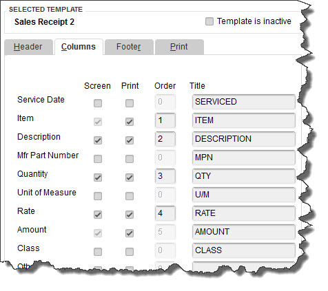 Click in the boxes below Screen and Print to indicate which columns should display on your QuickBooks screen and which should appear on the customer’s copy. The numbers in the Order column can be changed to reflect which column will come first, second, etc.